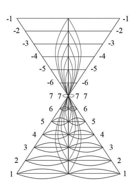Éste gráfico representa la conexión de nuestra existencia en cada plano (1.físico, 2.emocional, 3.mental, 4.programas, 5.lógica, 6.campo cuántico) con el vacío (7), que permite la existencia, y con la antimateria que la sostiene (los potenciales, números negativos).